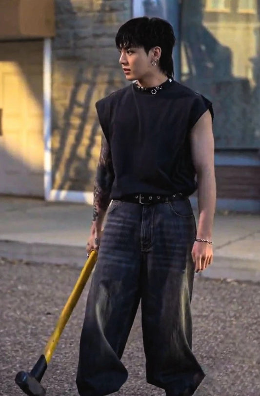 Jungkook-Inspired Black Baggy Washed Denim Jeans – BTS Edition